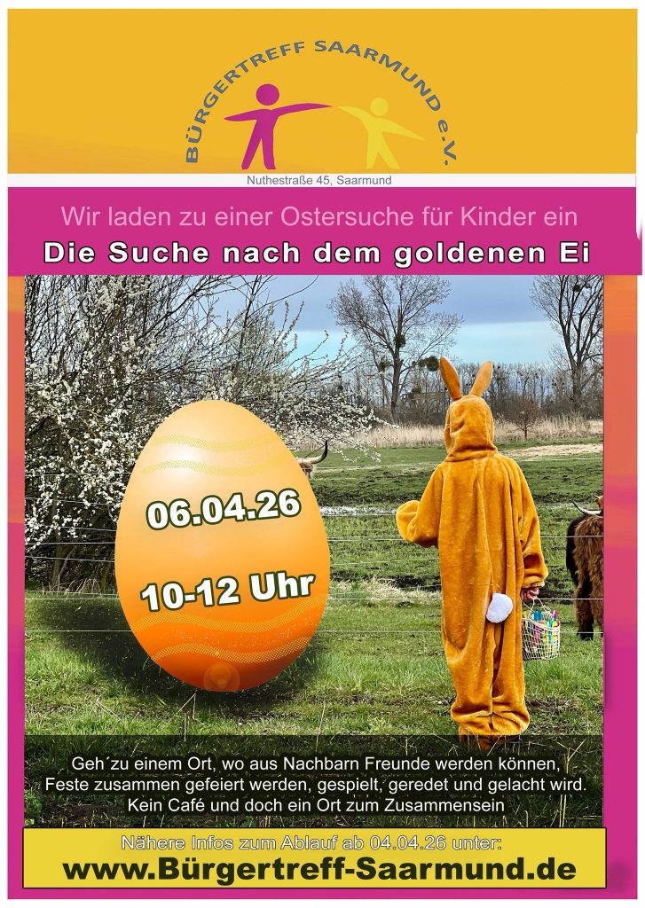 Wir laden am 06.04. von 10:00 bis 12:00 zu einer Ostersuche für Kinder ein.
