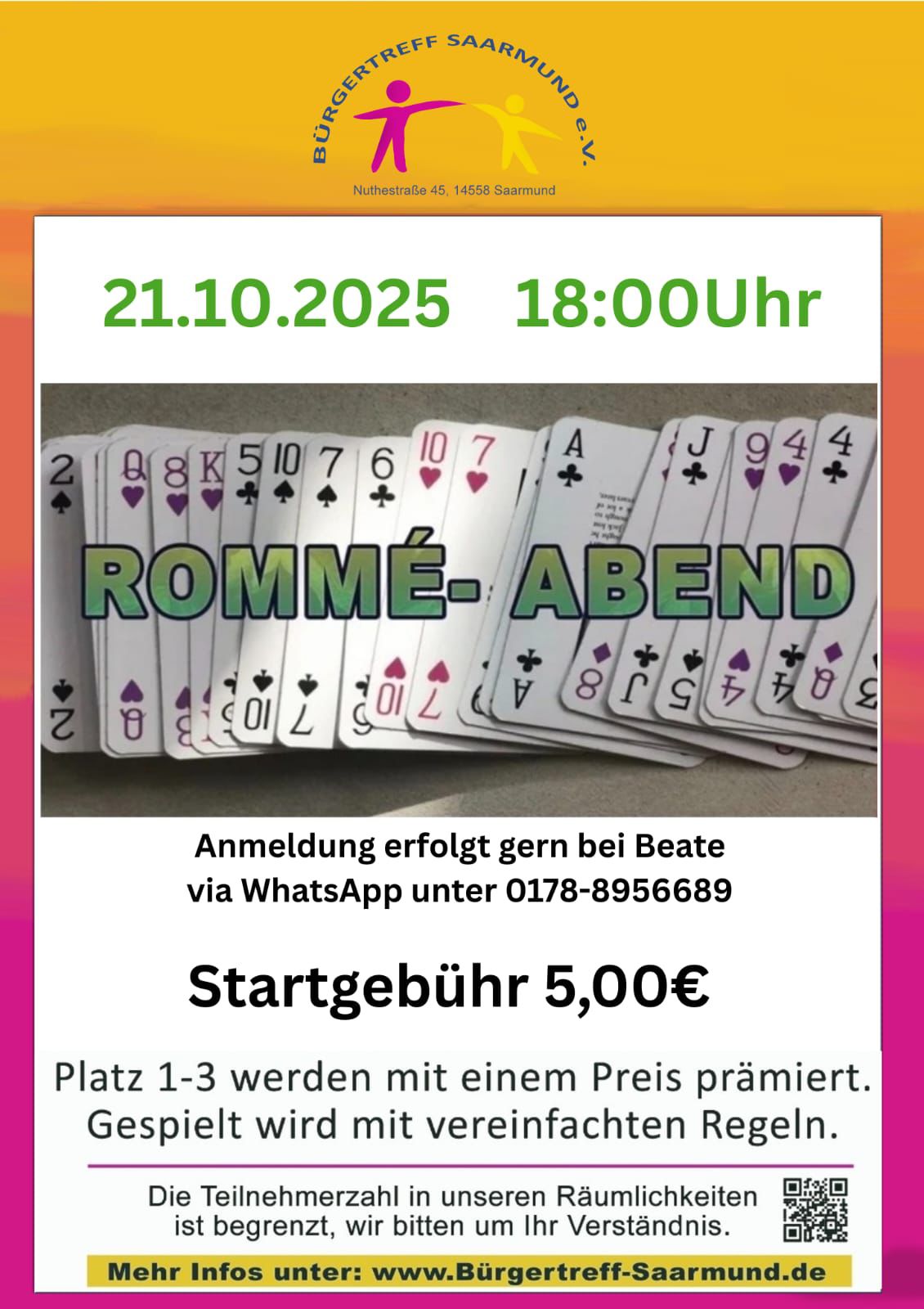 Am 21.10.2025 laden wir ab 18:00 Uhr zum Rommé-Abend in den Bürgertreff ein.