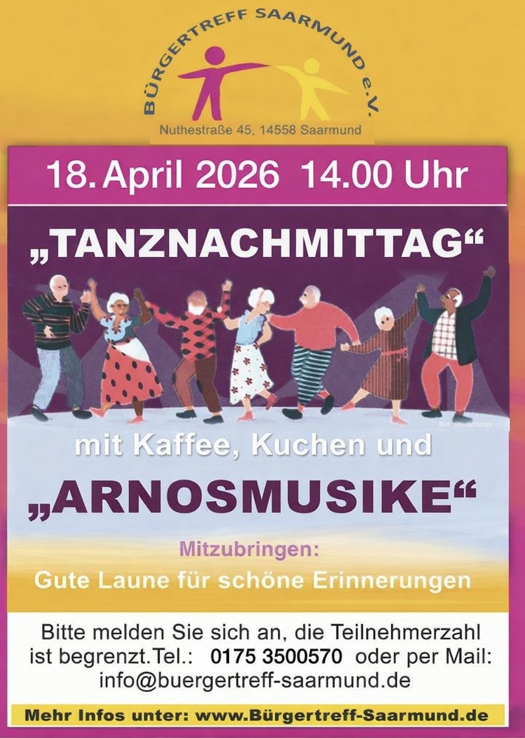 Samstag,den 18. April 2026 14.00 -17.00 Uhr Tanznachmittag mit Kaffee, Kuchen und Arnosmusike. Mitzubringen: Gute Laune für schöne Erinnerungen. Wir bitten aufgrund der begrenzten Teilnehmerzahl um Voranmeldung unter info@buergertreff-saarmund.de oder...
