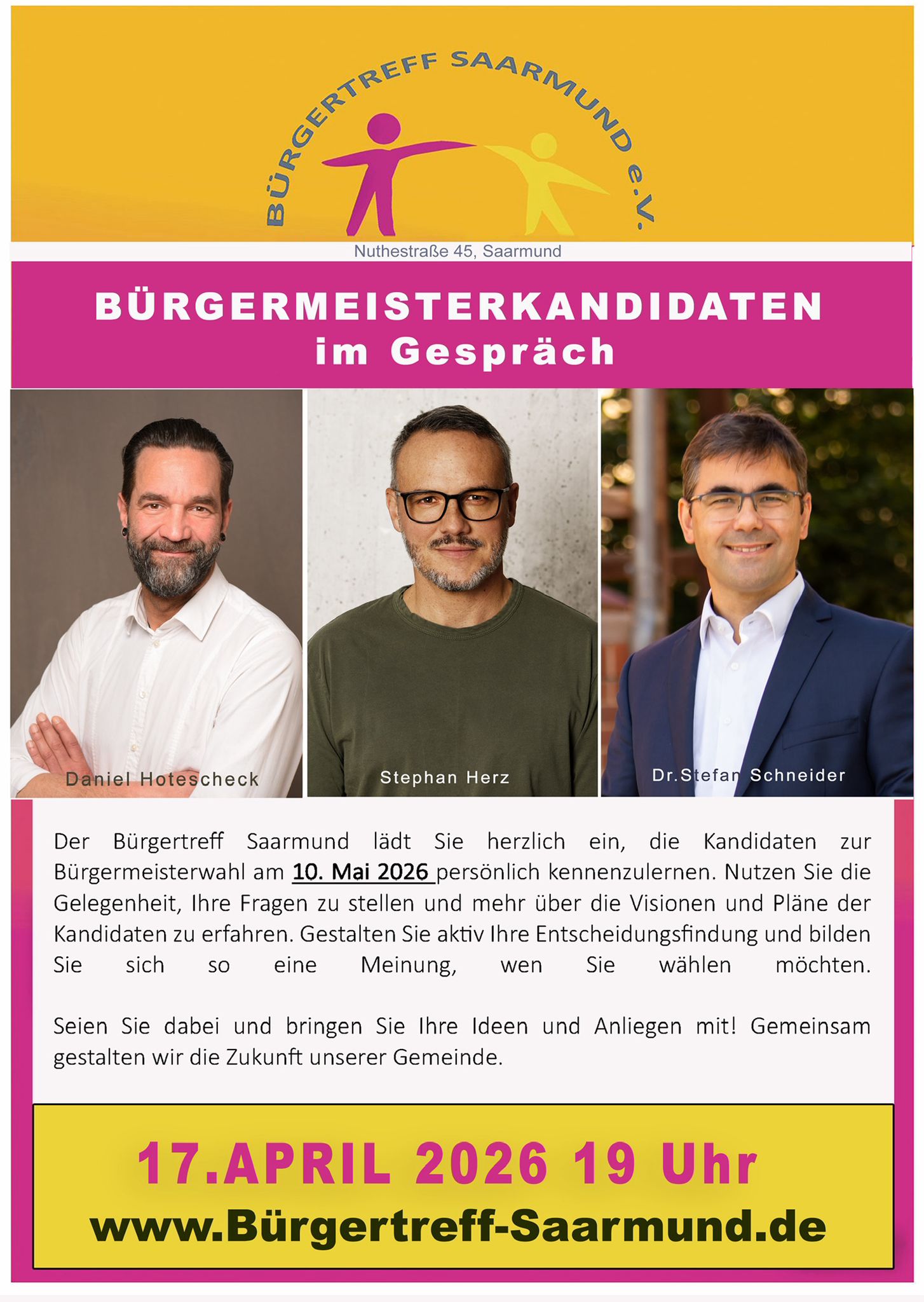 Am 17.04.2026 19:00 Uhr stellen sich die Kandidaten der Bürgermeisterwahl im Bürgertreff vor.