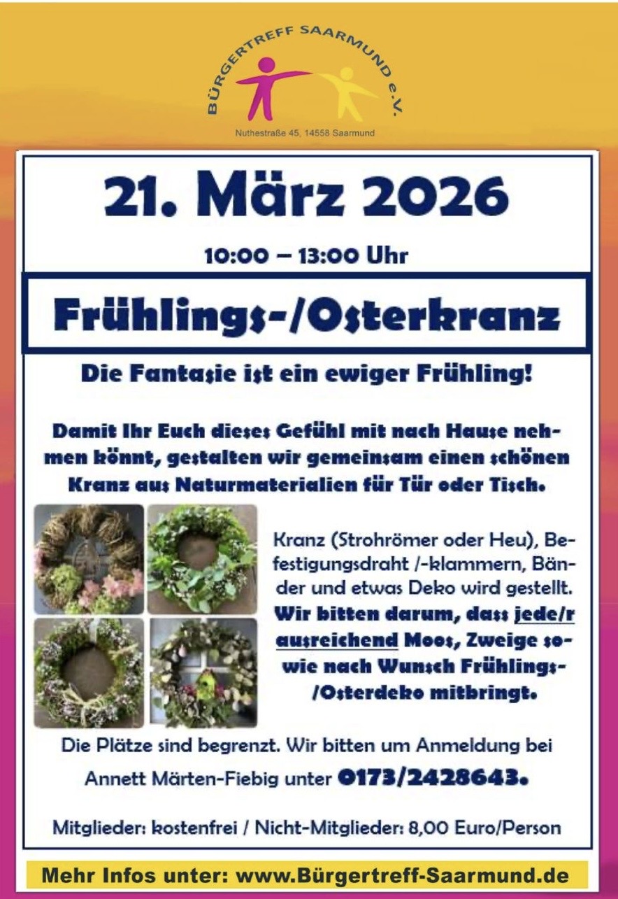 Wir gestalten gemeinsam aus Moos, Blattschmuck und Zweigen Frühlingskränze. Das Material wird gestellt, kann aber auch gern mitgebracht werden. Zielgruppe: Jugendliche/ Erwachasene Kostenbeitrag: 8€ / Vereinsmitglieder kostenfrei Die Teilnehmeranzahl ist...