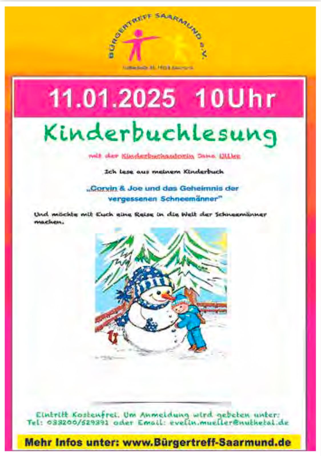 Für den 11.01.2025 10:00 Uhr ist die Kinderbuchautorin Jana Ullke zur Kinderlesung in den Bürgertreff Saarmund eingeladen. Titel des Buchs: Corvin & Joe und das Geheimnis der vergessenen Schneemänner. Corvin wartet schon sehnsüchtig auf den ersten Schnee, um seinen Freund Joe, den Schneemann, wiederzusehen. Beide verbindet eine tiefe Freundschaft und nur Corvin darf mit Joe...