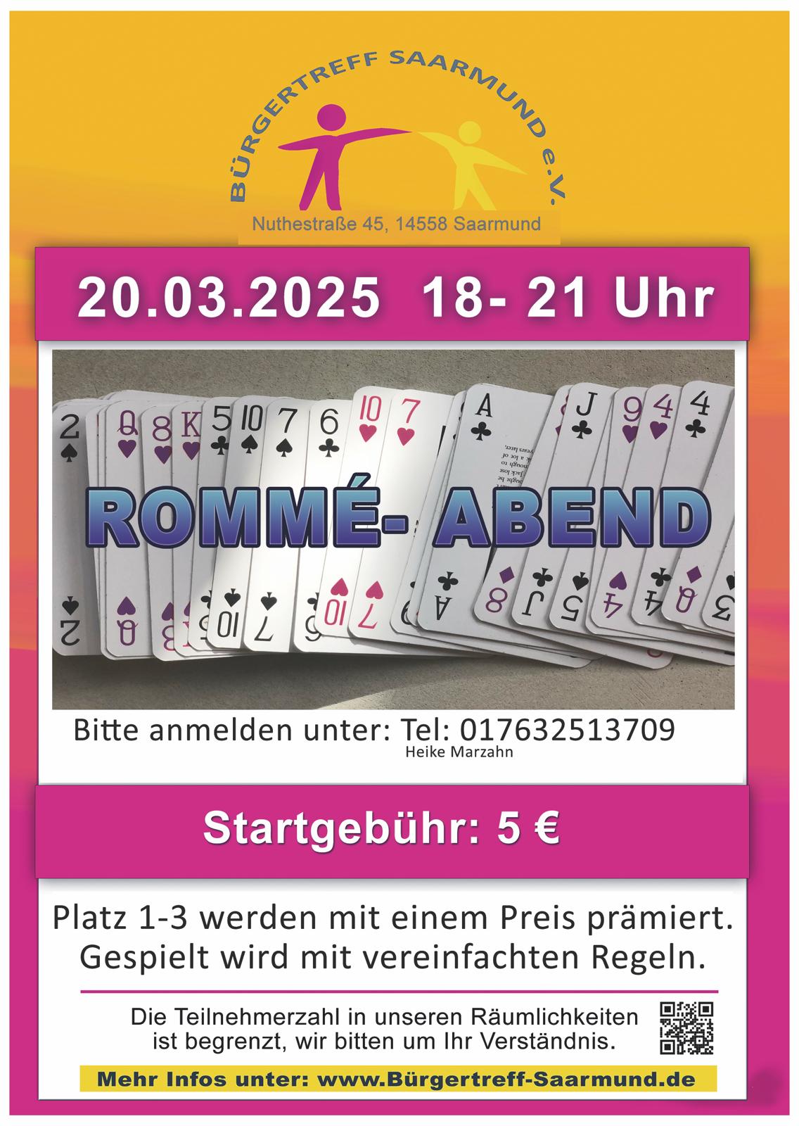 Am 20.03.2025 laden wir ab 18:00 Uhr zum Rommé-Abend in den Bürgertreff ein. Die Startgebühr beträgt 5,00 € (Vereinsmitglieder kostenfrei). Es gelten die vereinfachten Hausregeln. Die Gewinnplätze 1-3 werden attraktiv prämiert, der Viertplatzierte startet beim nächsten Mal ohne Startgebühr. Alle Interessierten melden sich bitte vorab unter 0176 325 137 09 oder info@buergertreff-saarmund.de an.